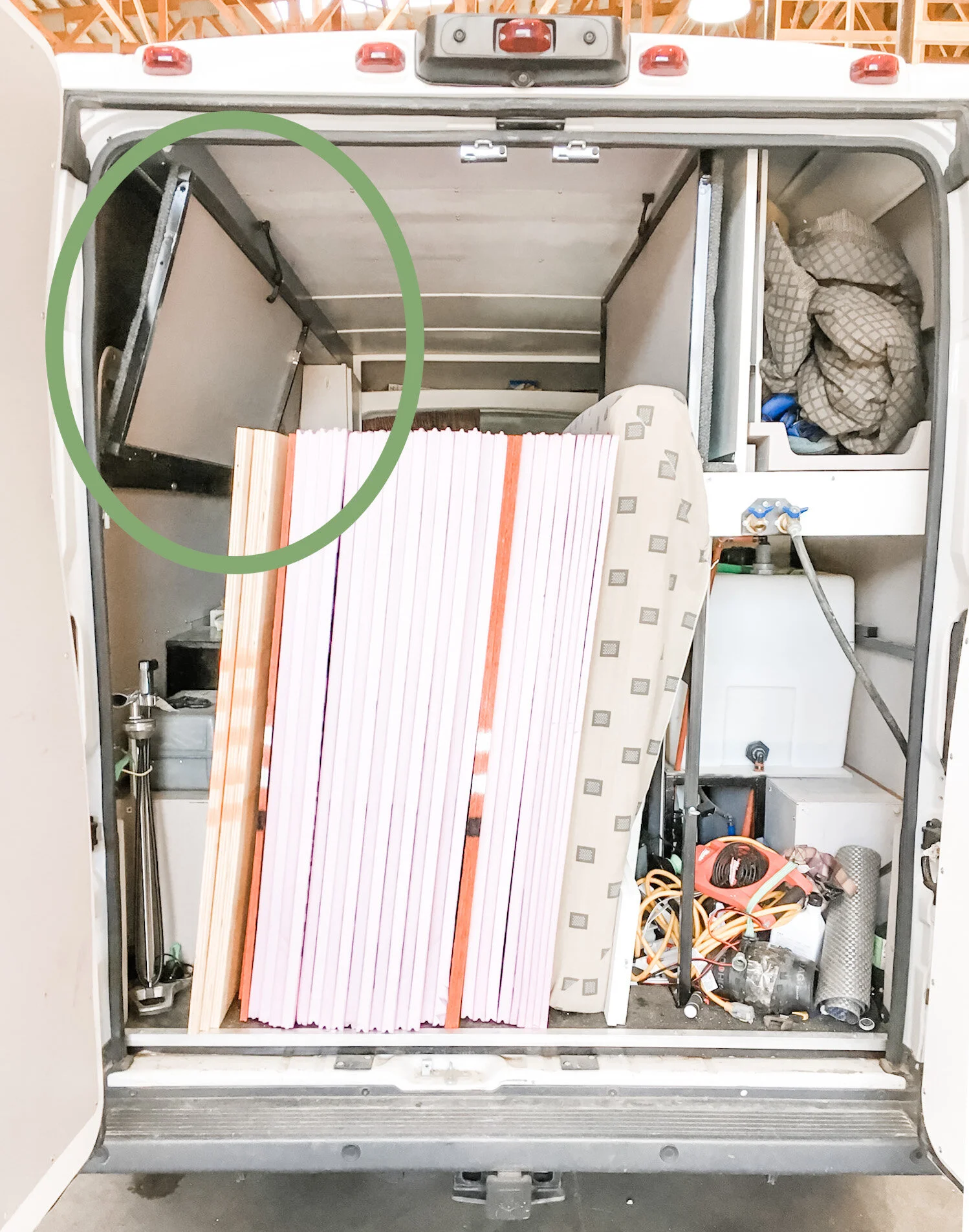Slide-out storage accessible from both the rear and the interior of the van. Sized specifically for luggage.
