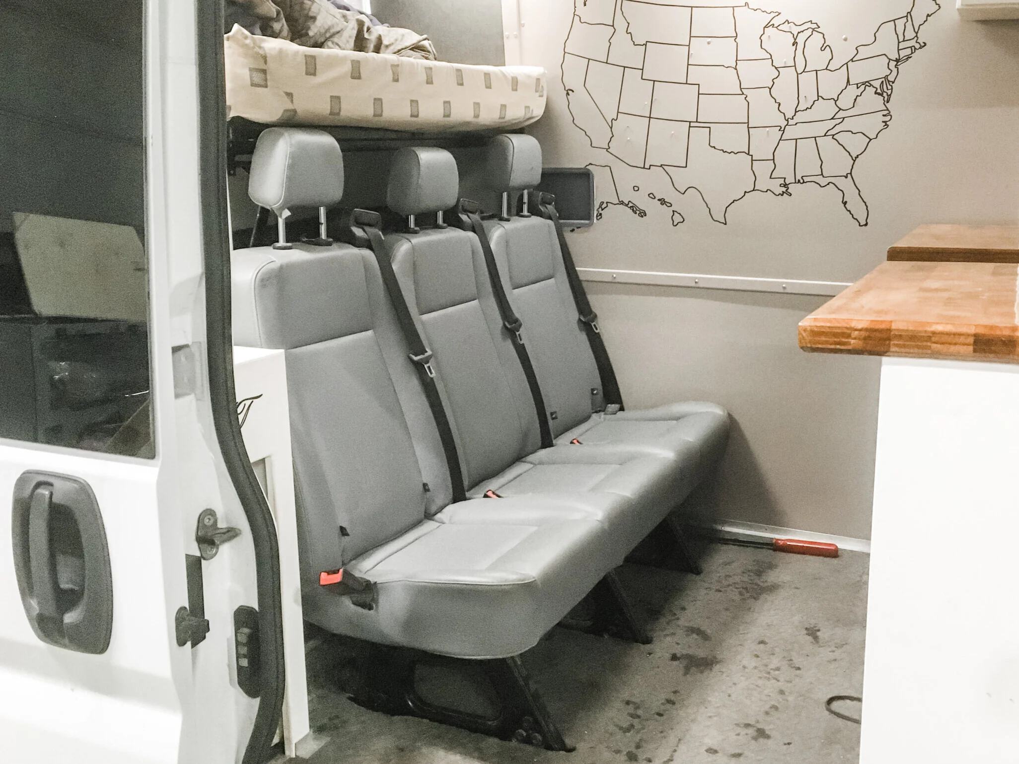 Tony prioritized ample space for hauling bikes and gear, leading him to install a fold-up bed. This prevented Tony from installing permanent structures beneath the bed, such as a dining and work table.